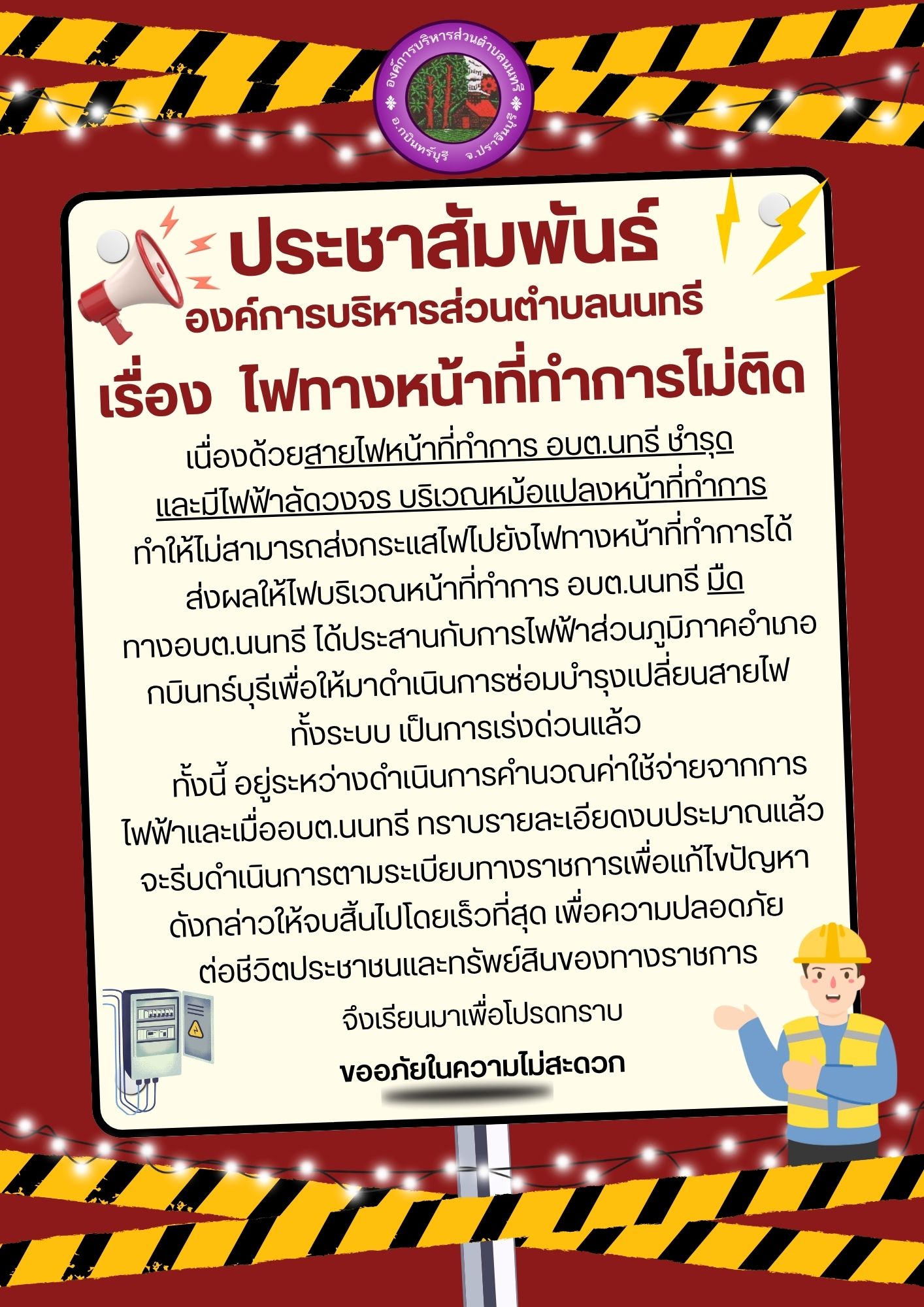 ทางอบต.นนทรี ได้ประสานกับการไฟฟ้าส่วนภูมิภาคอำเภอกบินทร์บุรีเพื่อให้มาดำเนินการซ่อมบำรุงเปลี่ยนสายไฟทั้งระบบ เป็นการเร่งด่วนแล้ว